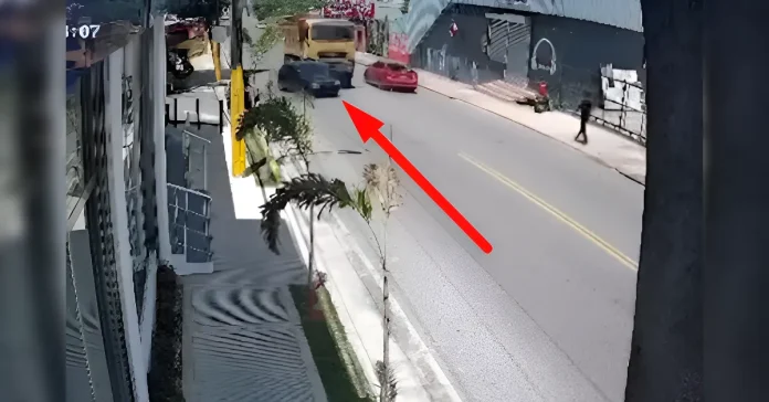 De acuerdo con imágenes captadas por cámaras de seguridad cercanas, un camión de carga tipo volteo de color amarillo transitaba por la avenida cuando se produjo una colisión lateral con un automóvil particular negro.