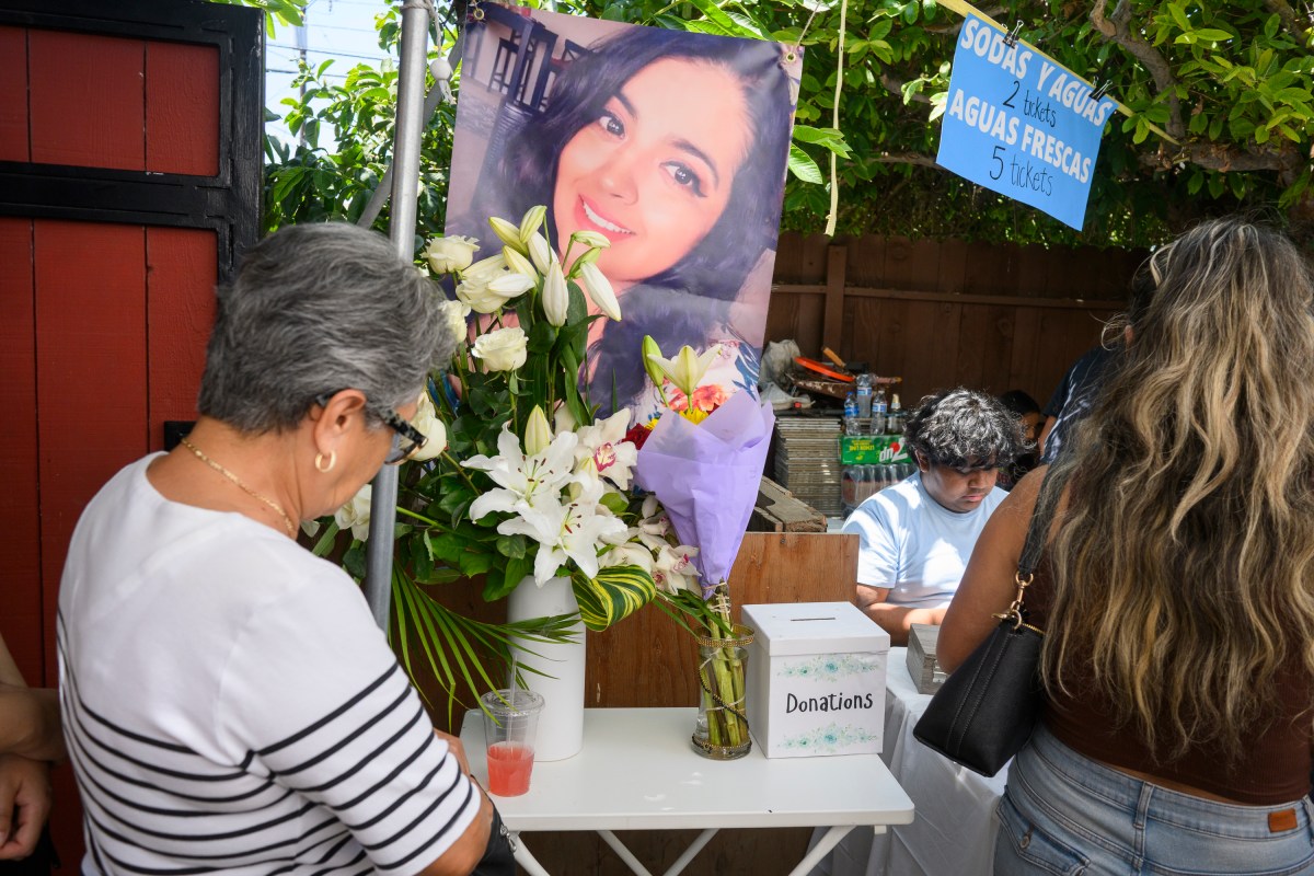Decenas de personas asistieron a la kermés en honor a Leticia Placencia Alvarado. La foto de la víctima de un accidente de tráfico estaba colgando en la entrada del patio junto con unas flores blancas en el hogar de su tía en Santa Ana.