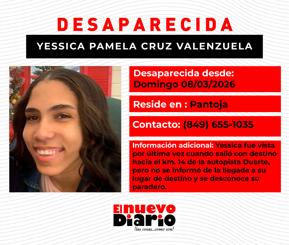 Familiares de Yessica Pamela Cruz Valenzuela, de 20 años, informaron este lunes que desconocen su paradero desde el domingo, cuando salió de Pantoja con destino al Kilómetro 14 de la autopista Duarte. Según sus parientes, no se ha confirmado su llegada al lugar y desde ese momento no han logrado establecer comunicación con ella, lo que ha generado preocupación.