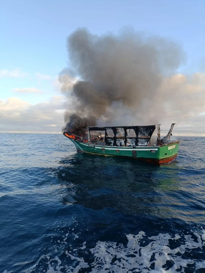 Salvamento Marítimo recibió a las 9:00 horas una llamada en la que alertaban de la presencia de una balsa salvavidas a la deriva, así como de un pesquero que se estaba incendiando.