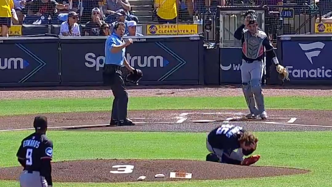 Ryan Weathers es golpeado en la cabeza por un tiro de su receptor durante calentamiento previo al juego