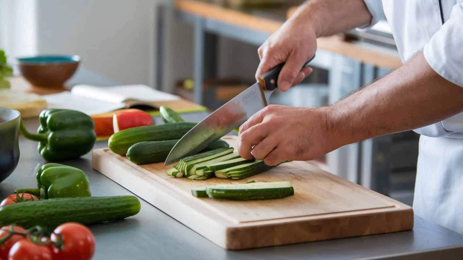 - Lava y corta los pepinos en rodajas finas.