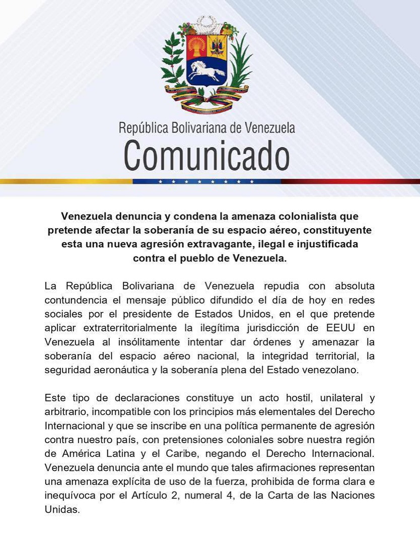 El comunicado enfatizó que la advertencia de Trump no corresponde con la información técnica disponible y que Venezuela mantiene canales de monitoreo constantes para garantizar condiciones de vuelo seguras dentro de su territorio, sin depender de orientaciones externas.