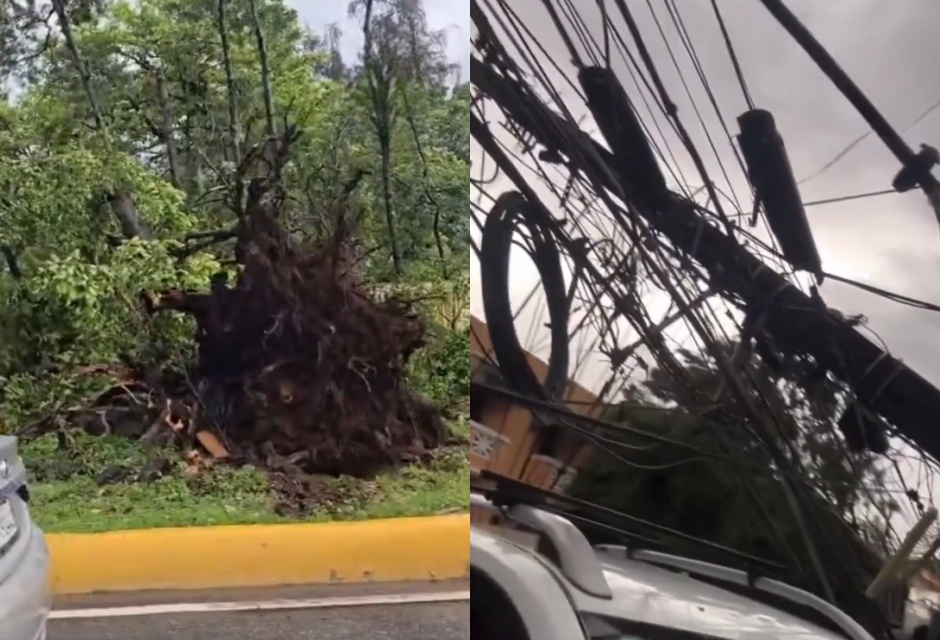 En la Universidad Autónoma de Santo Domingo (UASD), varios árboles se desplomaron dentro del campus, obstaculizando el paso de los estudiantes. Además, se observan cables del sistema eléctrico en el suelo tras ser arrastrados por las ramas caídas.