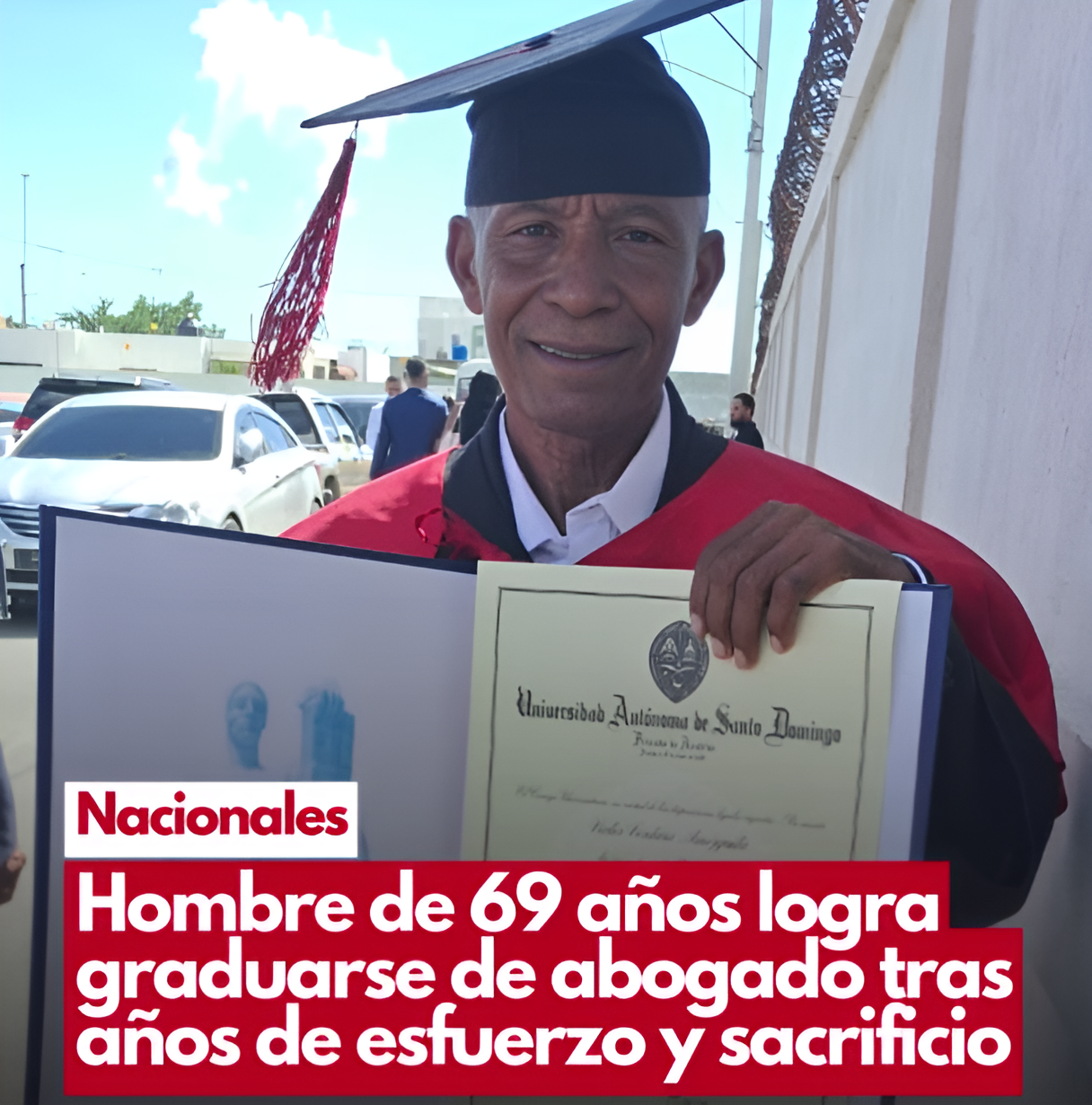 Víctor Ventura Amezquita, oriundo de Nagua, provincia María Trinidad Sánchez, celebró este miércoles la culminación de uno de sus mayores sueños al convertirse en licenciado en Derecho a los 69 años.