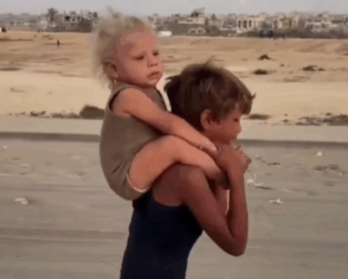 Las imágenes muestran también cómo, en ocasiones, el niño carga a otros sobre sus hombros, en un esfuerzo desesperado por salvar a los suyos. El gesto refleja la dura realidad de la niñez en Gaza, marcada por la guerra, el desarraigo y la necesidad de asumir responsabilidades que no corresponden a su edad.