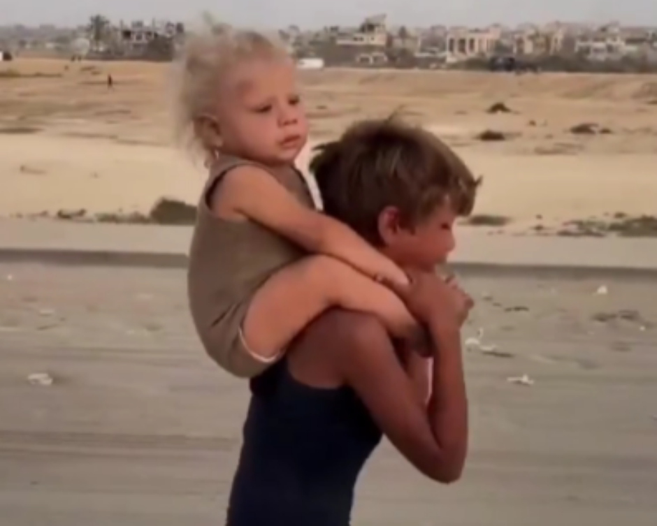 En el video, un niño desplazado del norte de Gaza camina descalzo hacia el sur con su hermana pequeña, mientras las lágrimas corren por su rostro. El menor, agotado y en silencio, continúa su camino entre multitudes de desplazados que, como él, buscan un lugar seguro frente a la violencia.