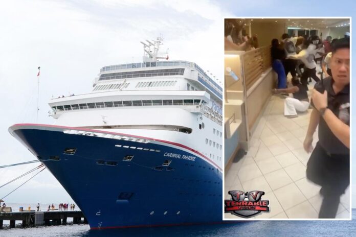 Un video perturbador captó el momento en que estalló una pelea masiva en un crucero de Carnival entre pasajeros furiosos aparentemente molestos por “tiras de pollo”.